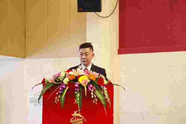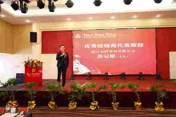 每一位經銷商都是金鹿的家人,也為了表達對“家人”這一重要角色的重視,金鹿集團在年會中還特別獻上“2018年度獲獎經銷商頒獎典禮”的環節,為一路信賴和陪伴金鹿成長的經銷商們敬上誠摯的感謝,并邀請了優秀經銷商代表郭冠耀先生上臺發表感言,暢談了他與金鹿攜手走過的歲月崢嶸。